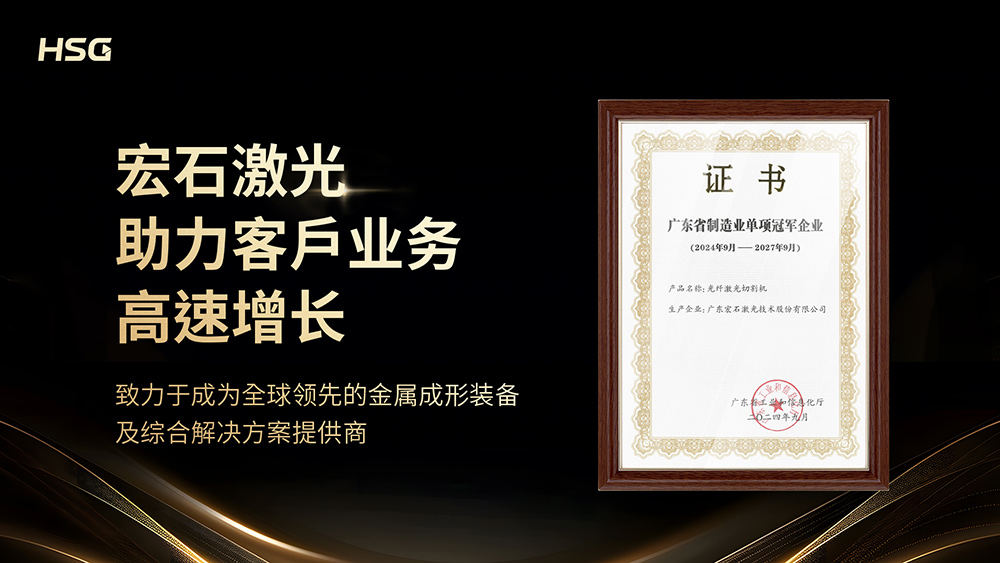 宏石激光自2006始創(chuàng)至今,已榮獲國(guó)家高新技術(shù)企業(yè)、國(guó)家知識(shí)產(chǎn)權(quán)優(yōu)勢(shì)企業(yè)獎(jiǎng)、行業(yè)創(chuàng)新大獎(jiǎng)等多項(xiàng)國(guó)家和行業(yè)榮譽(yù)。此次獲評(píng)“廣東省制造業(yè)單項(xiàng)冠軍企業(yè)”,是對(duì)宏石激光堅(jiān)實(shí)技術(shù)實(shí)力、良好產(chǎn)品品質(zhì)與強(qiáng)勁市場(chǎng)競(jìng)爭(zhēng)力的高度認(rèn)可。宏石激光堅(jiān)持以助力客戶業(yè)務(wù)高速增長(zhǎng)為品牌使命,一直不遺余力地通過(guò)優(yōu)質(zhì)產(chǎn)品、先進(jìn)服務(wù)等推動(dòng)中國(guó)制造實(shí)現(xiàn)智能化轉(zhuǎn)型,致力于成為全球領(lǐng)先的金屬成形裝備及綜合解決方案提供商。