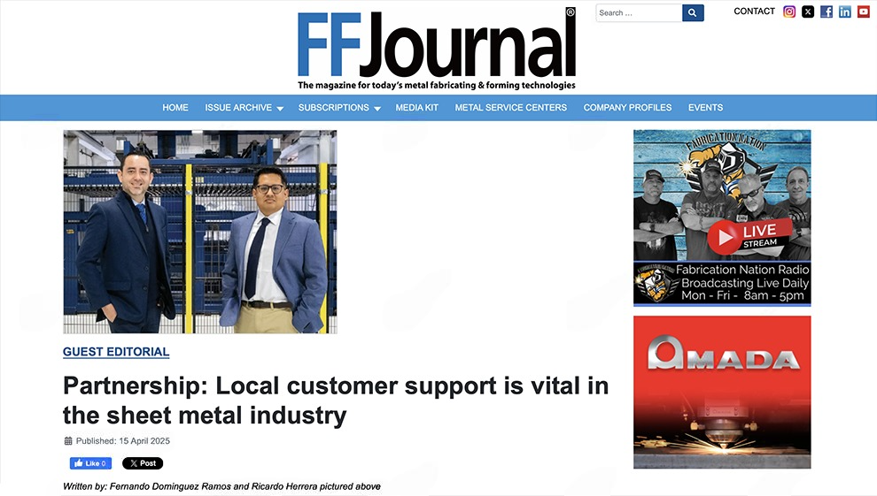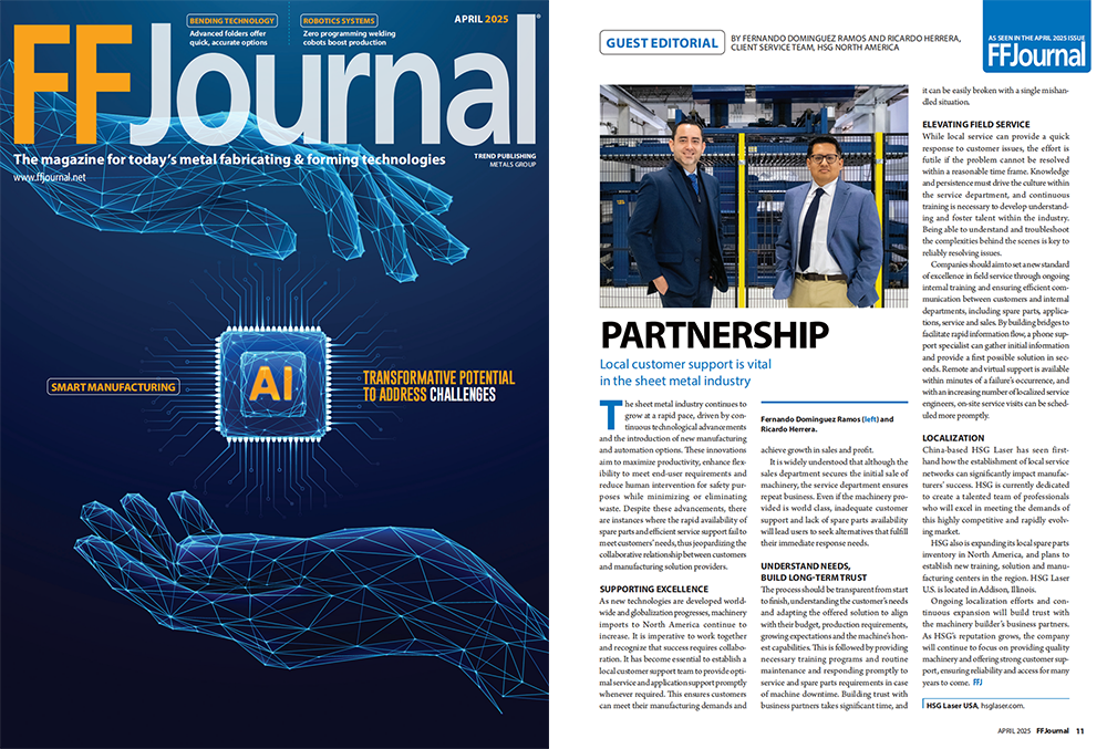 近日,宏山激光HSG Laser憑借在北美市場持續深化的本地化服務實踐,榮登北美金屬加工權威雜志《FFJournal》2025年4月刊。本期雜志特別刊載了由HSG北美區域團隊成員Fernando與Ricardo聯合撰寫的專題文章,聚焦“合作伙伴關系”主題,系統闡述了本地化售后服務和備件保障對于制造企業運營效率與客戶信任構建的重要價值。